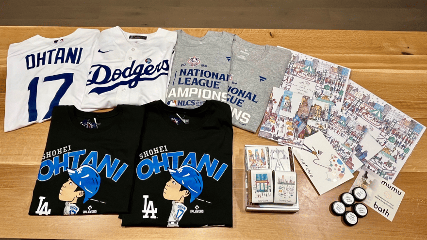 YouTube動画の方でも詳しくご紹介していますが、今回のお土産は、ニューヨークで活動するイラストレーター「natchie(ナッチ)」さんの2025年カレンダーにノート、 「mumu bath」の石鹸とリップバームなど、ニューヨーカーに選んでもらったオシャレなグッズと、 そしてそして冒頭ご紹介したみなさん大好き(?)MLBのユニフォームや記念Tシャツ各種を、抽選で19名さまにプレゼントします!
