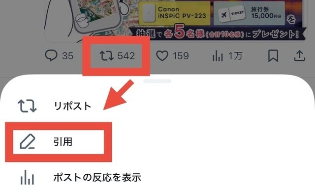 対象投稿の画面にあるリポストマークを押すと、「引用」と出てくるのでここをタップ。