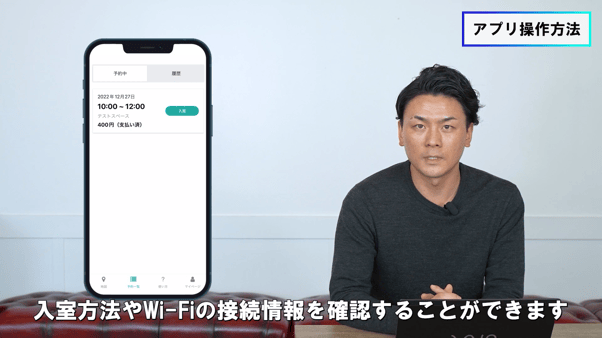アプリの「予約一覧」の施設情報の入室箇所、または予約完了時のメールに鍵の番号など入室に必要な情報が記載されていますので、説明に沿って入室してください。