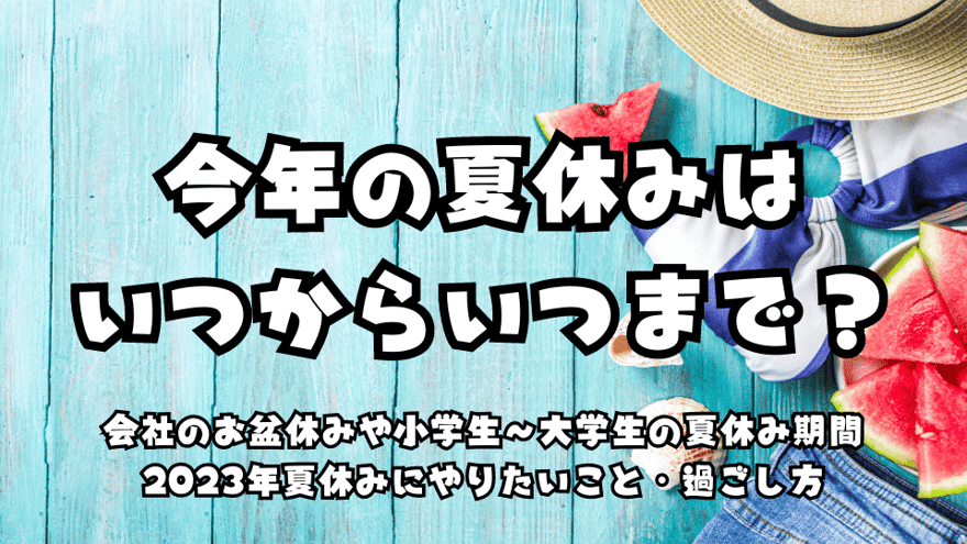 そんな2023年夏休みはいつからいつまで?夏休み・盆休みの予定を立てるための参考として、社会人や学生の夏休み期間や、夏休み・お盆休みにやりたいこと・過ごし方などをまとめています。